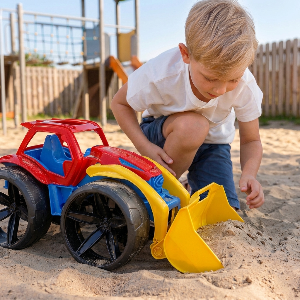 Duża, solidna konstrukcja oraz ruchoma łopata sprawiają, że pojazd doskonale sprawdza się podczas intensywnej zabawy – w piaskownicy, na podwórku, w ogrodzie czy w domu. Dziecko może podnosić, opuszczać i zgarniać materiały, odtwarzając pracę prawdziwych maszyn budowlanych. Mocne, stabilne koła zapewniają płynną jazdę po różnych powierzchniach.