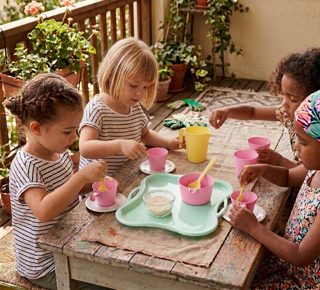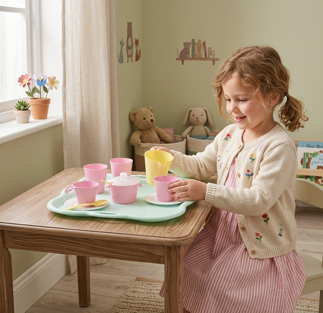 zabawa z wykorzystaniem zestawu naczyń Party Time pobudza wyobraźnię i twórcze myślenie dziecka, wspiera umiejętności społeczne, integrację z rówieśnikami oraz poprawia koordynację wzrokowo-ruchową, motorykę, umiejętności manualne i precyzję ruchów