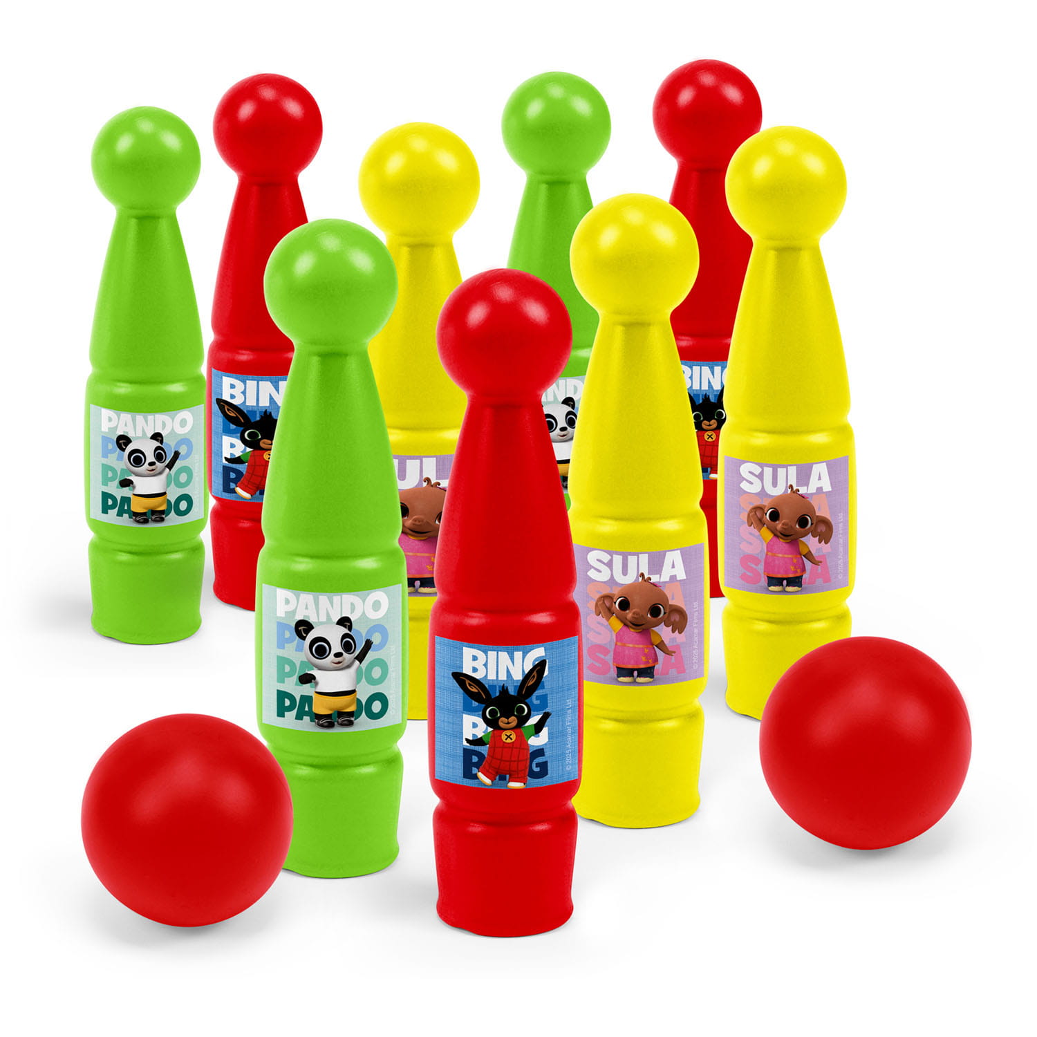 Kolorowy zestaw kręgli inspirowany bohaterami z bajki Bing. Wesołe grafiki i forma dopasowana do małych rączek sprawiają, że zabawa rozwija koordynację ruchową i motorykę dużą. Zestaw zapakowany w estetyczny kartonik — idealny na prezent.